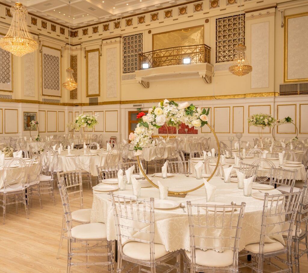 Step into the Alisha Suite, our masterpiece of sophistication and scale. This suite is designed for couples who dream of a truly grand Bradford wedding and need unparalleled capacity for their guest list. From the moment you enter, you are surrounded by a lavish expanse adorned in resplendent gold decorations, creating an ambiance of regal charm. The hall is transformed into a botanical wonderland with exquisite flower arrangements that weave a tapestry of colours and fragrances throughout your event.